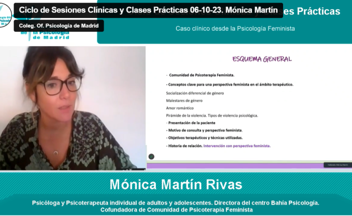 En esta charla presenté un caso clínico en el Colegio Oficial de Psicólogos de Madrid el 6 de octubre de 2023 titulado: Caso clínico desde la Psicología Feminista.